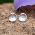 Ein an einen Sternenhimmel erinnerndes Funkeln und Schimmern trifft auf eine runde, nach innen gewölbte Formgebung: Diese in Handarbeit gefertigten Ohrstecker aus sandmattiertem 925/- Sterlingsilber mit einem mittig arrangierten Brillanten (insgesamt 0,02ct) sowie einer speziell bearbeiteten Oberfläche sind ein wahrer Hingucker am Ohr. Erhältlich mit passendem Anhänger und Ring.