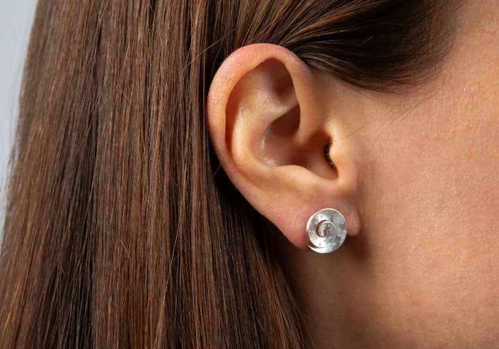 Einzigartige Designohrsteker "Sparkling Twist" aus mattiertem 925/- Sterlingsilber beeindrucken durch ein eingedrehtes, schneckenförmiges Design. Die punktierte Oberflächenbearbeitung erinnert an einen funkelnden Sternenhimmel und verleiht den Schmuckstücken eine besondere und stilvolle Ausstrahlung. Ein zauberhaftes Design aus der Feder der Düsseldorfer Designerin Nadine Resch. Perfekt in Kombination mit dem passenden Anhänger.