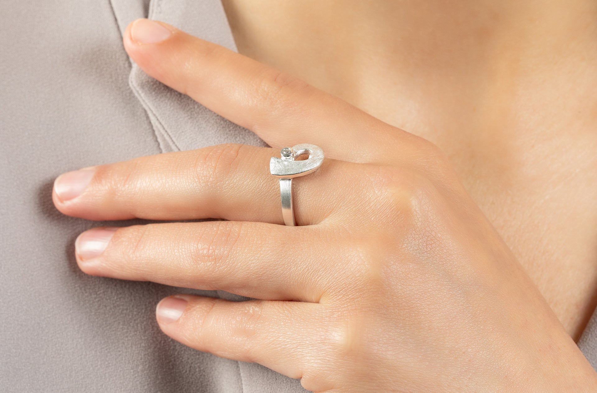 Verspieltes Design aus mattiertem und kratzmattiertem 925/- Sterlingsilber: Dieser zauberhafte Ring aus der Feder der Düsseldorfer Designerin Nadine Resch besticht durch einen funkelnden Brillant mit 0,02ct und seine dynamische Formgebung. Ein wertvoll verarbeitetes Schmuckstück mit dem Zeug zum absoluten Lieblingsschmuckstück.