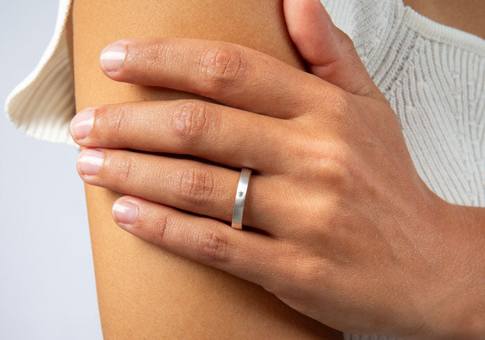 Ein niedliches Herzdetail in der nach oben leicht schmaler werdenden Ringschiene verleiht diesem Klassiker eine persönliche und symbolträchtige Note. Der aus strichmattiertem 925/-Sterlingsilber gefertigte Ring mit einem mittig positionierten und zum Brillanten geschliffenen Diamanten (0,02ct, W-SI) besticht durch eine klare und gradlinige Formensprache, eine durchweg wertige Verarbeitung und ein zeitloses Design. Als Antragsring "oder einfach so", dieser Fingerschmuck ist das ideale Geschenk für wirklich jeden Anlass.
