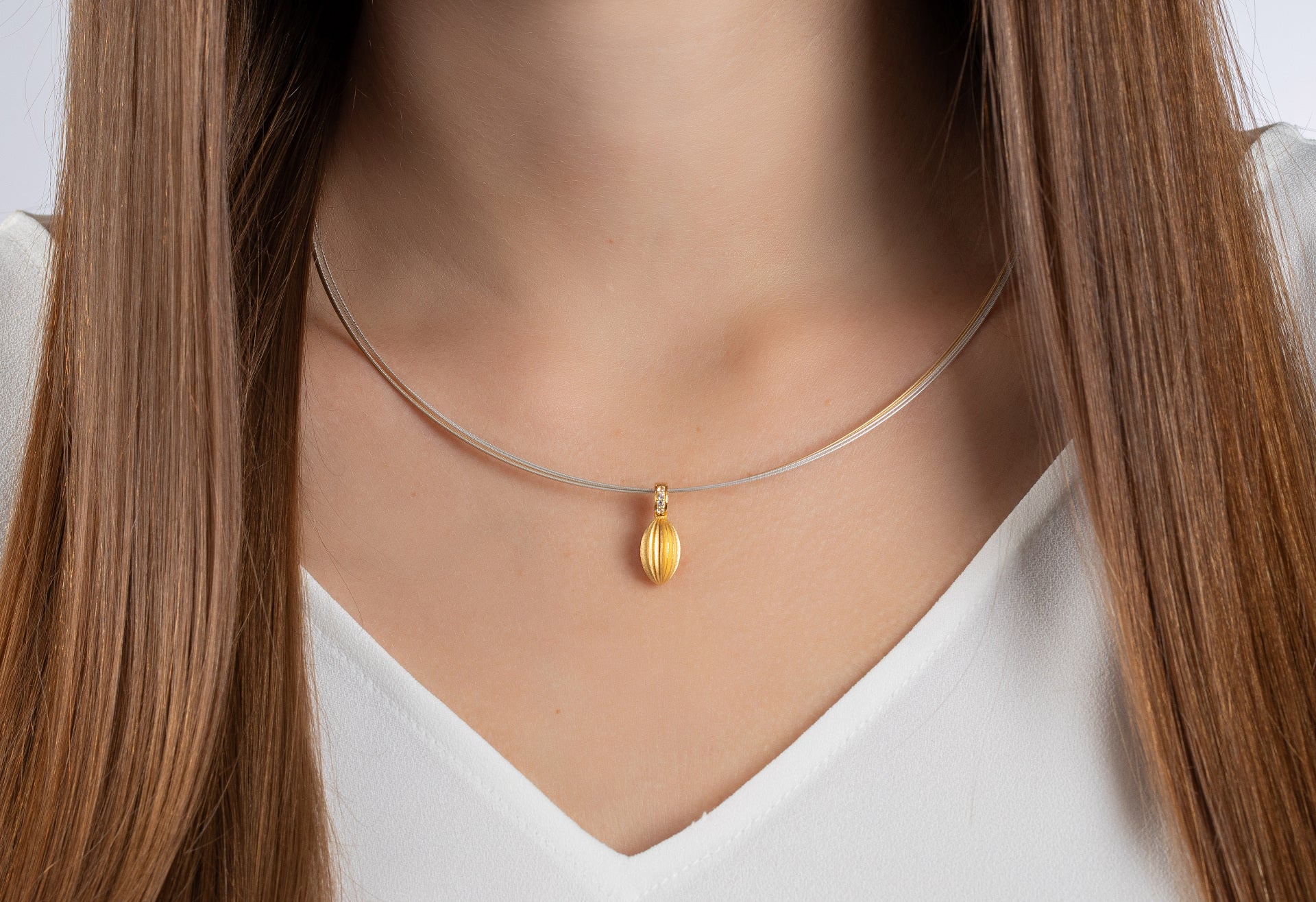 Ein zauberhafter Designanhänger aus vergoldetem und zugleich sandmattem 925/- Sterlingsilber trifft auf vier weiße Topase mit insgesamt 0,04ct. Die charakteristische Formgebung in einer aufgefecherten Optik lässt diesen von Hand gearbeiteten Halsschmuck zu einem wirkungsvollen Hingucker werden und verleiht dem Schmuckstück eine einzigartige und elegante Ausstrahlung. Perfekt in Kombination mit den dazugehörigen Ohrhängern.