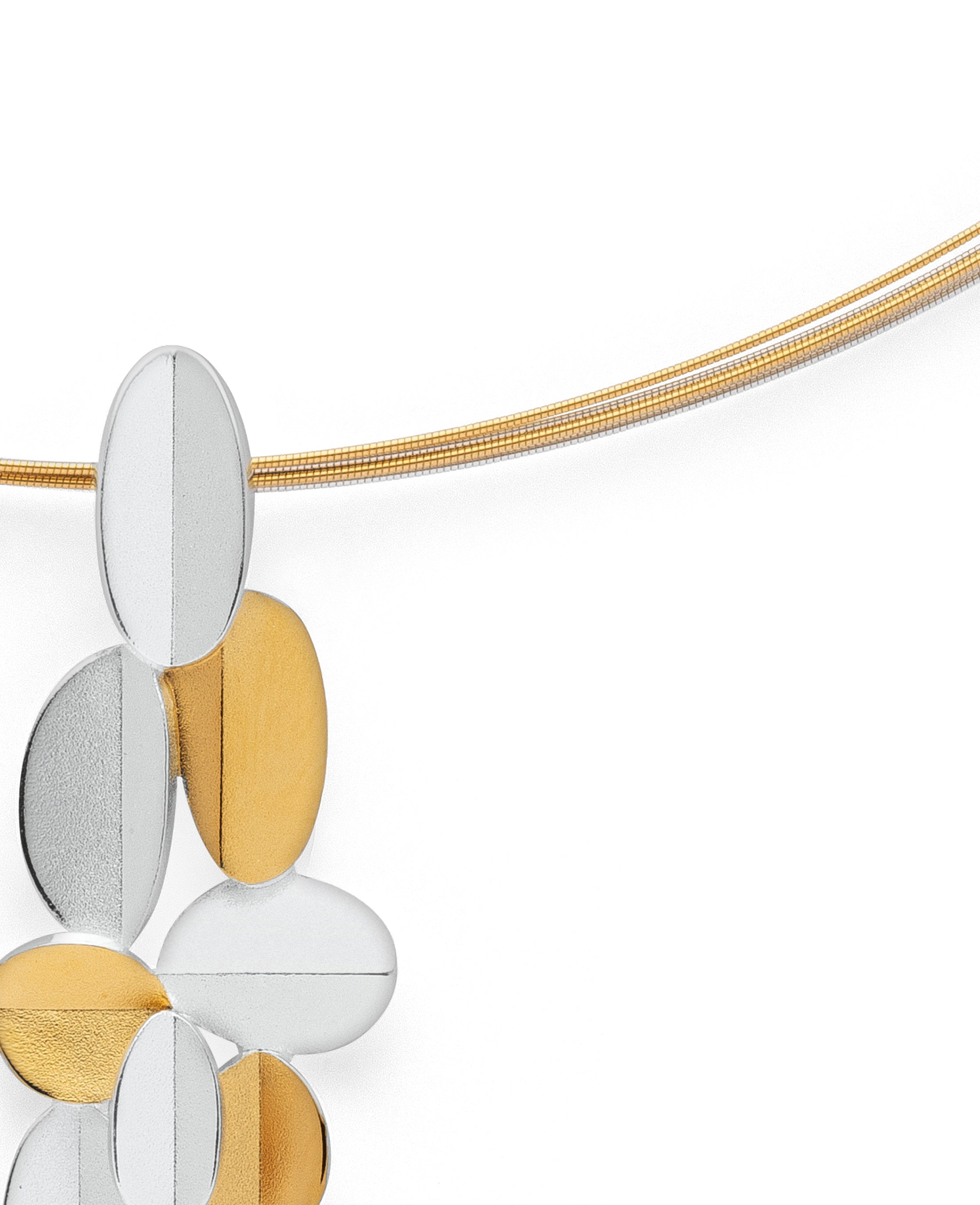 Aufwändig gearbeiteter Halsreif aus 5 feinen bicoloren Strängen aus teilvergoldetem 925/- Sterlingsilber mit Stahlkern und Doppelclipverschluss. Die neue praktische Verschlussart ermöglicht ein besonders leichtes Öffnen und Schließen. In mehreren Längen erhältlich.