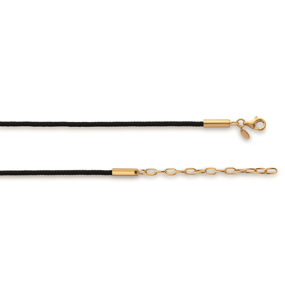 2 mm dickes und 50 cm langes Nylon Band in einer schwarzen Ausführung und einem 18 Karat gelbvergoldetem Karabinerverschluss sowie einem 5 cm langen Verlängerungskettchen. Ein praktisches Band, welches das Tragen von Anhängern auf vielen unterschiedlichen Höhen erlaubt.