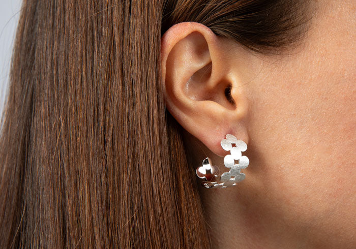 Diese geometrisch inspirierte Design-Creolen aus kratzmattiertem 925/- Sterlingsilber besticht durch vielzählig zusammengefügte, runde Schmuckelemente. Ein modernes und zugleich stilvolles Schmuckdesign aus der Feder der Designerin Nadine Resch. Perfekt in Kombination mit dem passenden Collier und Ring erhältlich. Für den besonders hohen Tragekomfort werden diese Creolen mit großer Ohrmutter geliefert, die das Gewicht des Ohrschmucks optimal am Ohr verteilen.