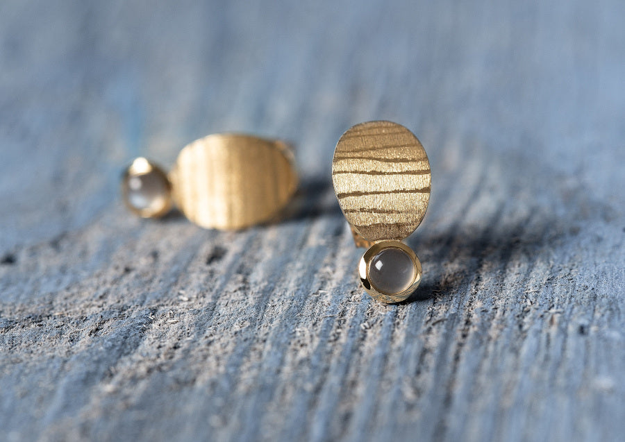 Zwei changierende graue Mondsteine (0,30ct) im attraktiven Cabochon-Schliff sind der Höhepunkt dieser mattierten Ohrstecker aus wertigem 750/- Gelbgold (18 Karat). Feine, von Hand gearbeitete Linien sorgen für den durchweg hochwertigen und handwerklichen Charakter dieser Neuheit aus der bastian inverun Goldkollektion. Perfekt in Kombination mit passendem Anhänger. Ausschließlich im Fachhandel erhältlich!
