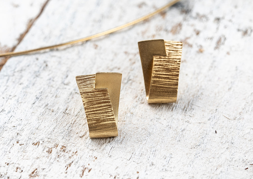 Designstarke Ohrstecker aus 750/- Gelbgold. Die einzigartige Faltoptik und die charakterstarke Oberflächenbearbeitung lässt diesen von Hand gearbeiteten und aus erlesenen Materialien hergestellten Ohrschmuck zu einem wirkungsvollen Hingucker werden, an dem man ein Leben lang Freude haben wird. Erhältlich mit dazugehörigem Anhänger und passendem Ring. Exklusiv im Fachhandel erhältlich.