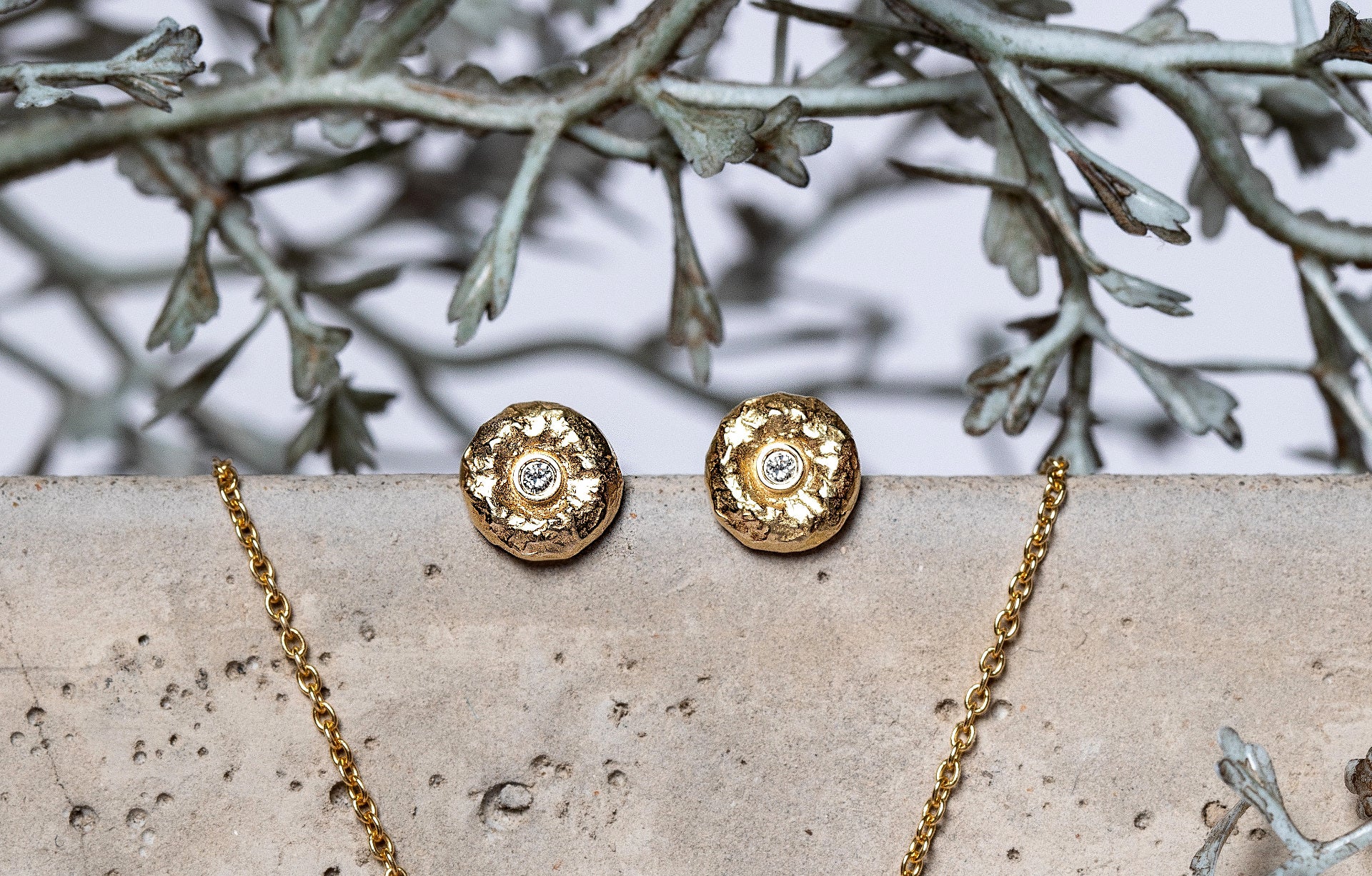 Ein einzigartiger Designohrstecker aus 750/- Gelbgold trifft auf funkelnde und mittig positionierte Brillanten (insgesamt 0,03ct; W-SI). Die spezialtexturierte Oberfläche verleiht dem Schmuckstück eine besonders spannende Ausstrahlungskraft. Designt von Thomas Mayer und perfekt in Kombination mit dem passenden Anhänger. Exklusiv im Fachhandel erhältlich!