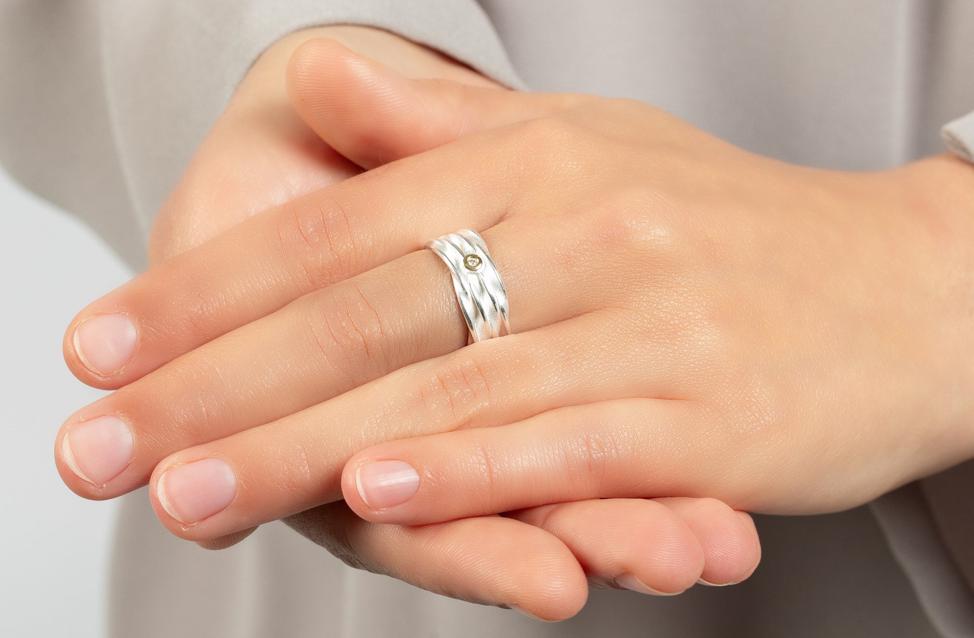 ´Diamond Silver Wave Collection‘ – ein zauberhafter Ring aus 925/- Sterlingsilber, der sich durch eine einzigartige und charakteristische Oberflächengestaltung auszeichnet, trifft auf einen mittig in einer goldbelöteten Fassung arrangierten funkelnden Brillanten mit 0,015ct. Die breite Ringschiene sowie die charakteristische Oberfläche zeigen die hochwertige Verarbeitung dieses Designschmuckstücks und lassen ihn so zu einem echten Hingucker werden. Perfekt in Kombination mit dem passenden Anhänger und den passenden Ohrsteckern.