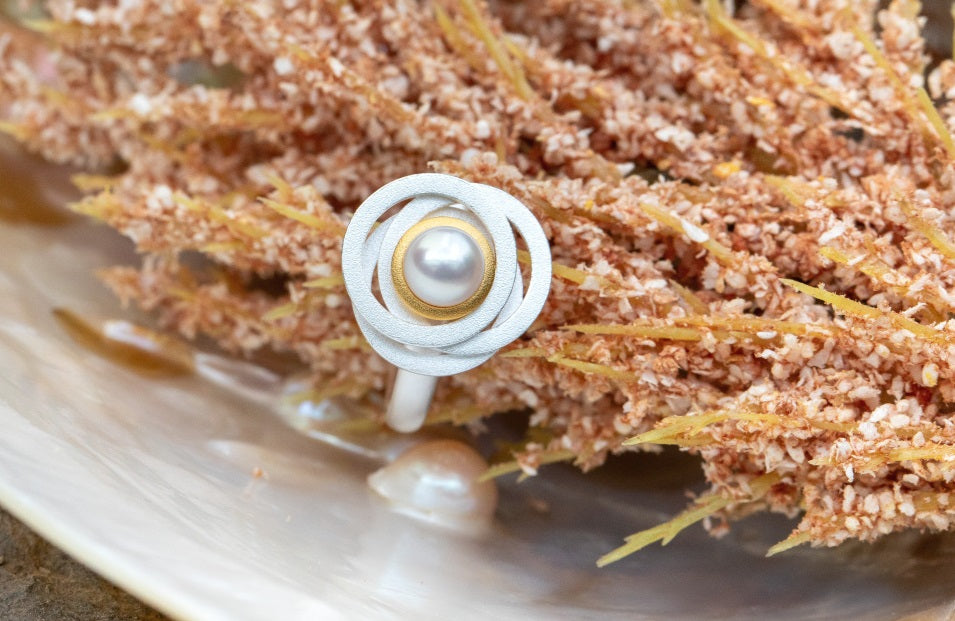 Drei sich überlagernde runde Schmuckelemente aus sandmattiertem 925/- Sterlingsilber treffen auf eine schimmernd weiße Zuchtperle (1,28ct) in polierter, vergoldeter Fassung. Zusammengefügt ergibt sich ein charakteristischer und dynamisch geformter Designring aus der Feder der Designerin Nadine Resch. Perfekt als Set in Kombination mit den passenden Ohrsteckern und dem passenden Anhänger erhältlich.