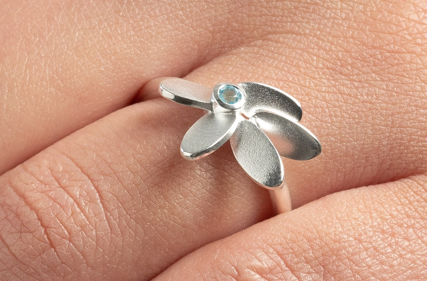 Dieser zauberhafte Ring aus sandmattiertem 925/- Sterlingsilber überzeugt mit einem floral inspirierten Design, welches durch den facettierten Blautopas (0,09ct) in besonderer Weise hervorgehoben wird. Die norwegische Designerin Kaja Gjedebo vermittelt mit dem Schmuckstück einen filigranen und zugleich verspielten Stil, der sowohl für den alltäglichen als auch für den besonderen Anlass designt wurde.