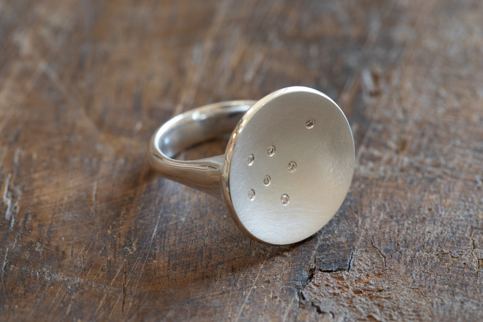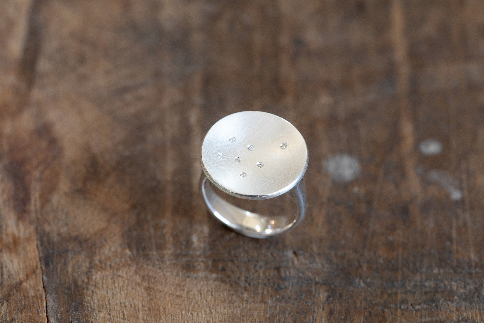 Ein an einen Sternenhimmel erinnerndes Funkeln und Schimmern trifft auf eine runde, nach innen gewölbte Formgebung: Dieser in Handarbeit gefertigte Ring aus mattiertem und poliertem 925/- Sterlingsilber mit insgesamt 7 ganz unterschiedlich arrangierten Diamanten (insgesamt 0,035ct) ist ein wahres Design-Highlight.