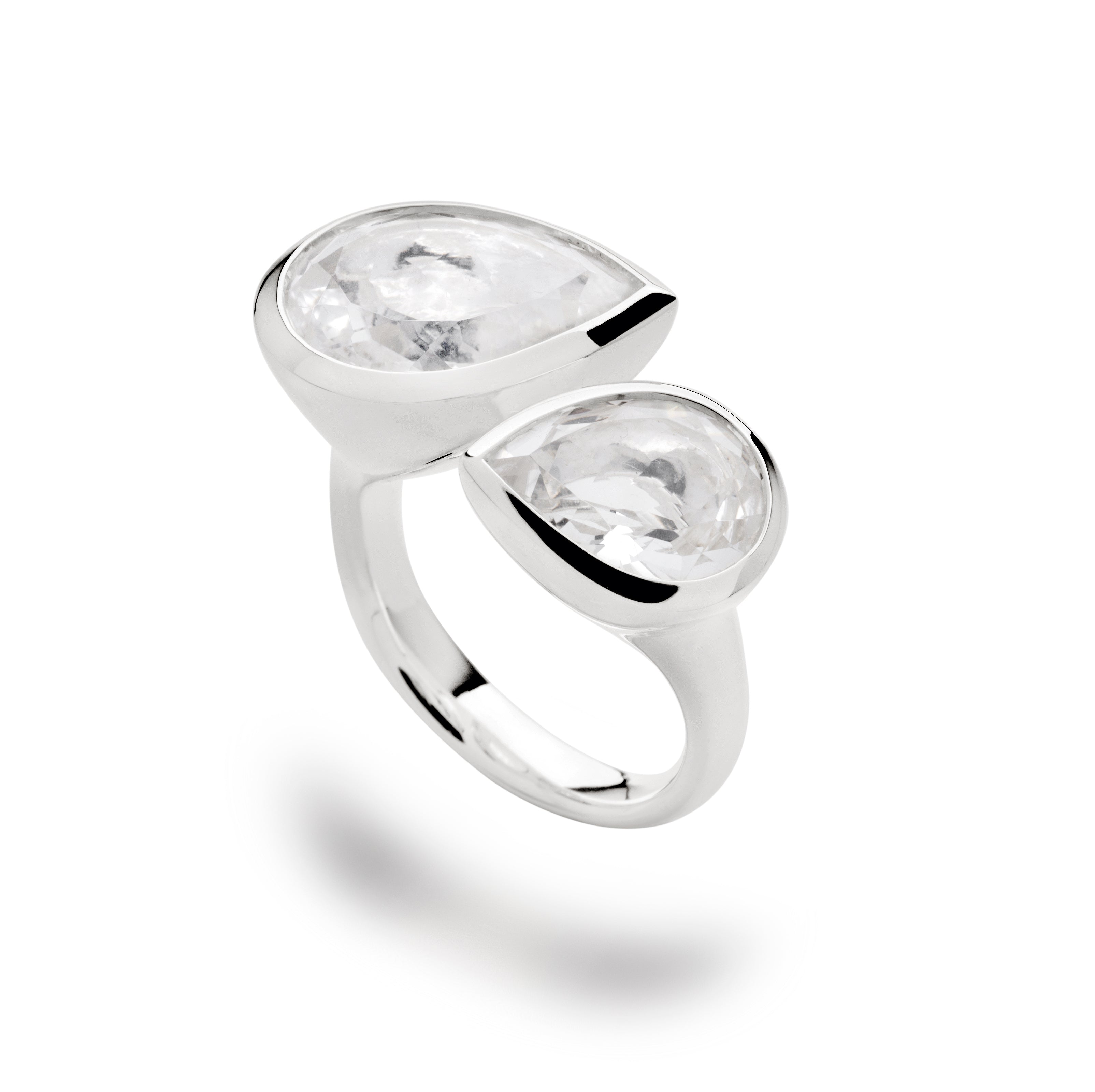 0815 war gestern: Zwei markante, zu formvollendeten Tropfen geschliffene Bergkristalle mit insgesamt 9,45ct zieren dieses designstarke Hingucker-Schmuckstück aus 925/- Sterlingsilber, welches nach oben hin geöffnet ist.