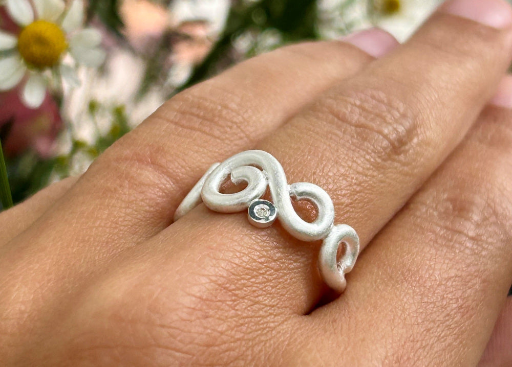 Strahlender Ring "Sweet Embrace" aus kratzmattiertem Sterlingsilber, der durch einen in einer polierten Fassung arrangierten, funkelnden Diamanten im wertigen Brillantschliff (0,015ct; W-SI) gekrönt wird. Die verschnörkelte Form betont die feminine Ausstrahlung dieses romantisch-verspielten Designschmuckstücks aus der Feder der deutschen Designerin Nadine Resch. Perfekt in Kombination mit dem dazugehörigen Anhänger und dem passenden Ohrschmuck.