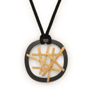 "The Mikado Signature Collection"- das Erfolgsdesign von bastian inverun erhält eine neue Auflage. Feine, länglich geformte Schmuckelemente aus 18 Karat vergoldetem 925/- Sterlingsilber ergeben zusammengefügt diesen Anhänger, welcher in einem schwarz rhodinierten rundlichen Rahmen eingefasst ist. Durch die besondere ungleichmäßige Anordnung der stabförmigen Elemete erhält das Schmuckstück einen individuellen handwerklichen und goldschmiedigen Look. Wir empfehlen für diesen Statement-Anhänger ein Band, welches als "Affenschaukel" in den Anhänger eingeknotet werden kann (z.B. Artikel 48610, 48620 oder 48630 ). Erhältlich mit passenden Ohrsteckern und passenden Ohrhängern.
