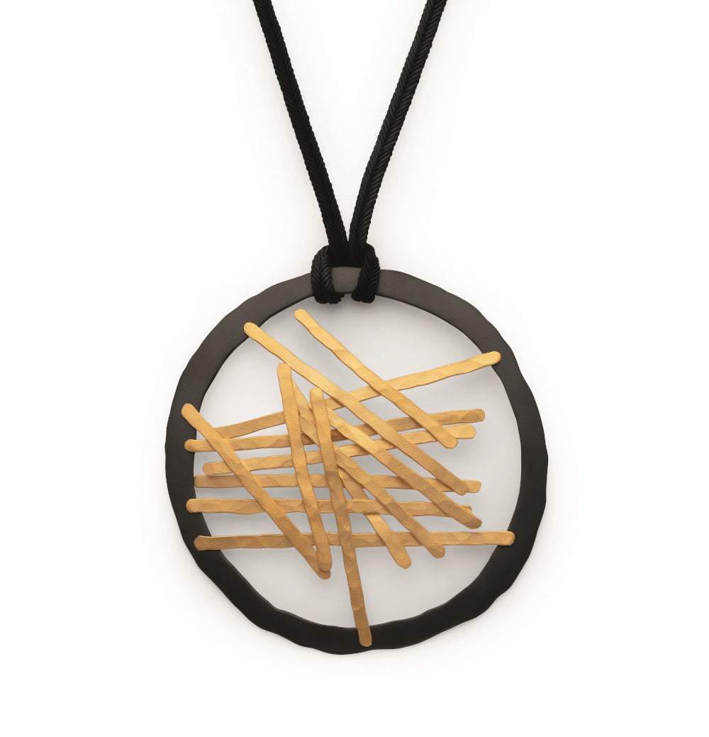 "The Mikado Signature Collection"- das Erfolgsdesign von bastian inverun erhält eine neue Auflage. Feine, länglich geformte Schmuckelemente aus 18 Karat vergoldetem 925/- Sterlingsilber ergeben zusammengefügt diesen Anhänger, welcher in einem schwarz rhodinierten rundlichen Rahmen eingefasst ist. Durch die besondere ungleichmäßige Anordnung der stabförmigen Elemente erhält das Schmuckstück einen individuellen handwerklichen und goldschmiedigen Look. Wir empfehlen für diesen Statement-Anhänger ein kräftigeres Band, welches als "Affenschaukel" in den Anhänger eingeknotet werden kann (z.B. Artikel 48580). Erhältlich mit passenden Ohrsteckern und passenden Ohrhängern.