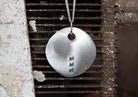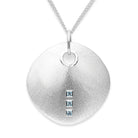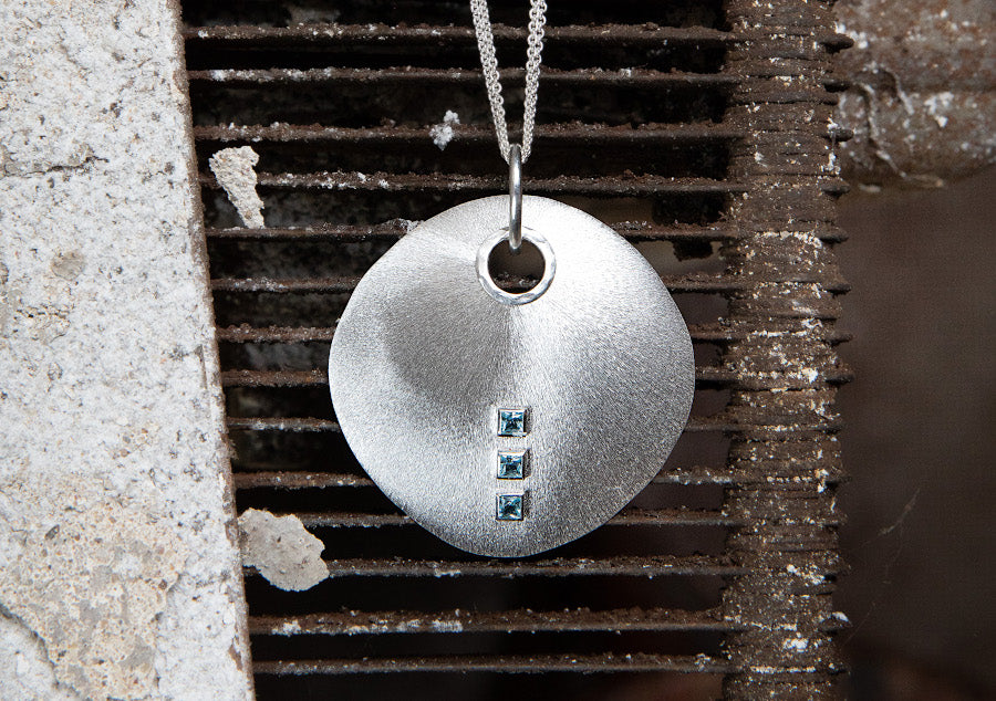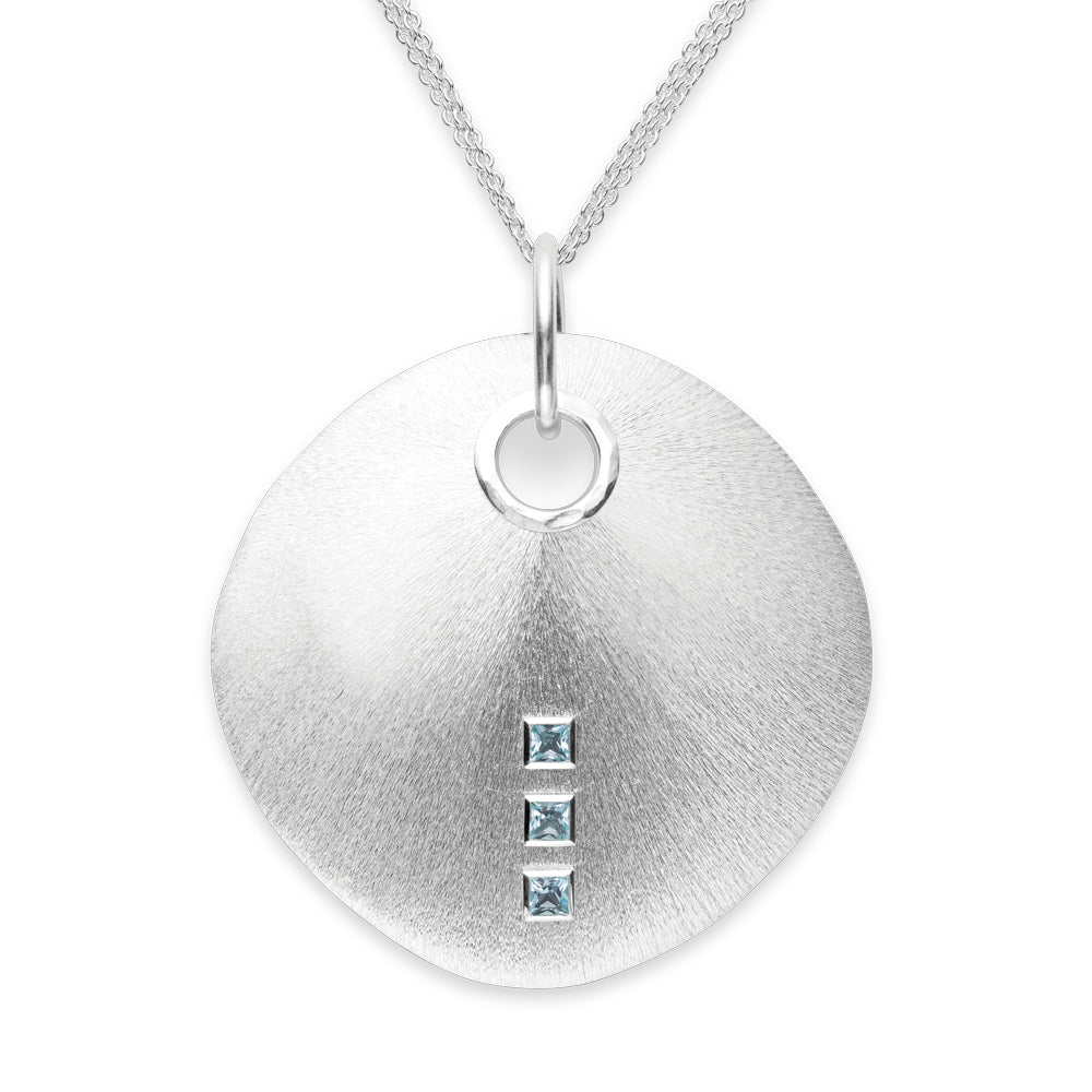 Gebürstetes 925/- Sterlingsilber formt sich zu einer mit drei im Princess-Schliff geschliffenen Blautopasen (insgesamt 0,59ct) versehenen Schmuck-Scheibe in besonderer Manufakturqualität. Die in Hammerschlagoptik gearbeitete Umrandung des Ösenloches sorgt für die besonders hochwertige und markante Ausstrahlung des Schmuckstücks aus der Feder des renommierten Osnabrücker Designers Dietmar Sebastian. Wir empfehlen diesen Designschmuckanhänger mit Unikatcharakter an einer längeren Kette oder einem längeren Band (ab 50cm). Auch in einer kleineren Version aus vergoldetem Silber mit Rauchquarz erhältlich.