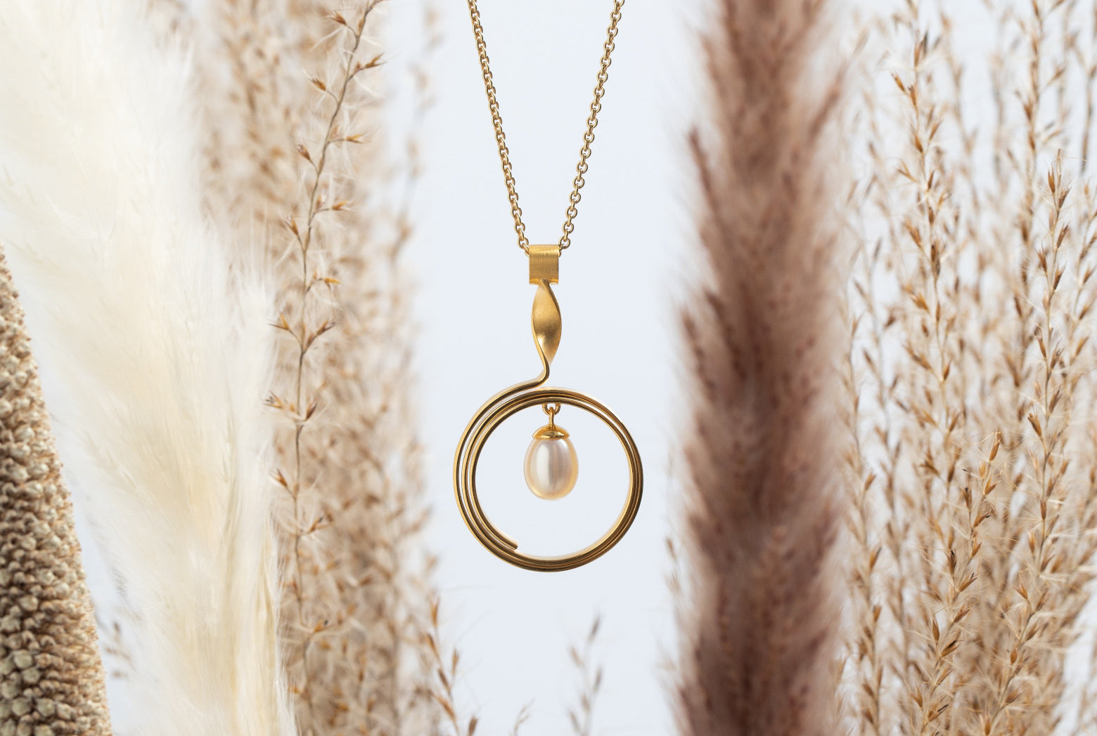 Der gewickelte und gedrehte Anhänger aus 18 Karat vergoldetem 925/- Sterlingsilber überzeugt mit einer charakteristischen Formgebung und einer mittig in Szene gesetzten, frei schwingenden Süßwasserzuchtperle (3,12ct) in Tropfenform. Dieses einzigartige Designschmuckstück wurde von dem Osnabrücker Designer Dietmar Sebastian kreiert.
