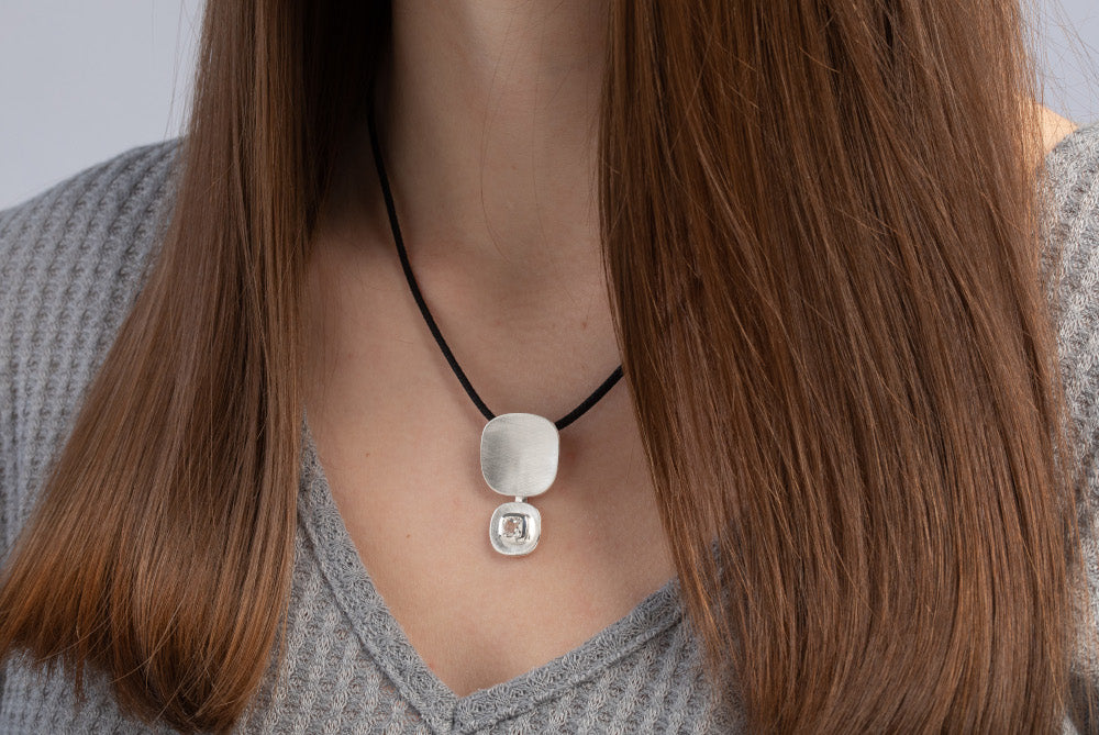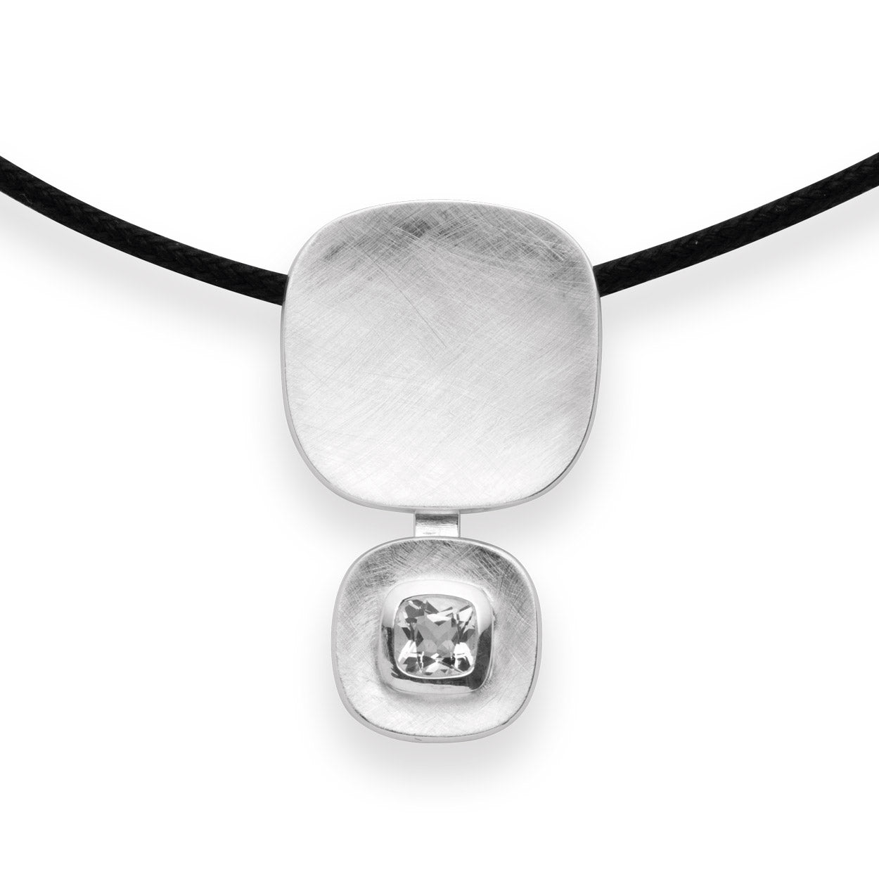 Ein geometrisch inspirierter Anhänger aus kratzmattiertem 925/- Sterlingsilber trifft auf einen funkelnden weißen Topas im attraktiven Kissenschliff mit 0,72ct, der insbesondere durch die polierte Fassung perfekt hervorgehoben und in Szene gesetzt wird. Die versteckte Aufhängung auf der Rückseite des Anhängers sorgt für die besonders elegante Ausstrahlung des ansonsten sportlich kombinierbaren Designschmuckstücks.