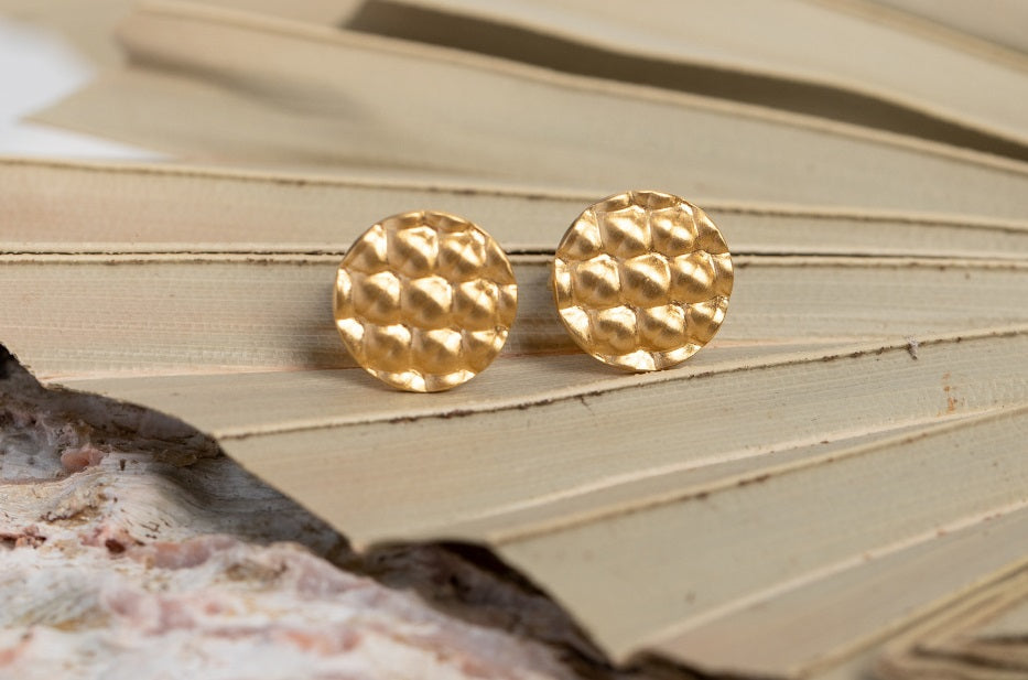 Ein an der Natur angelehntes Schmuckdesign aus vergoldetem 925/- Sterlingsilber besticht durch eine charakteristische Oberflächenstruktur. Die besonders hochwertige und markante Ausstrahlung lässt die in feinster Handarbeit gefertigten Designohrstecker zu wahren Hinguckern werden. Perfekt in Kombination mit dem dazugehörigen Anhänger.