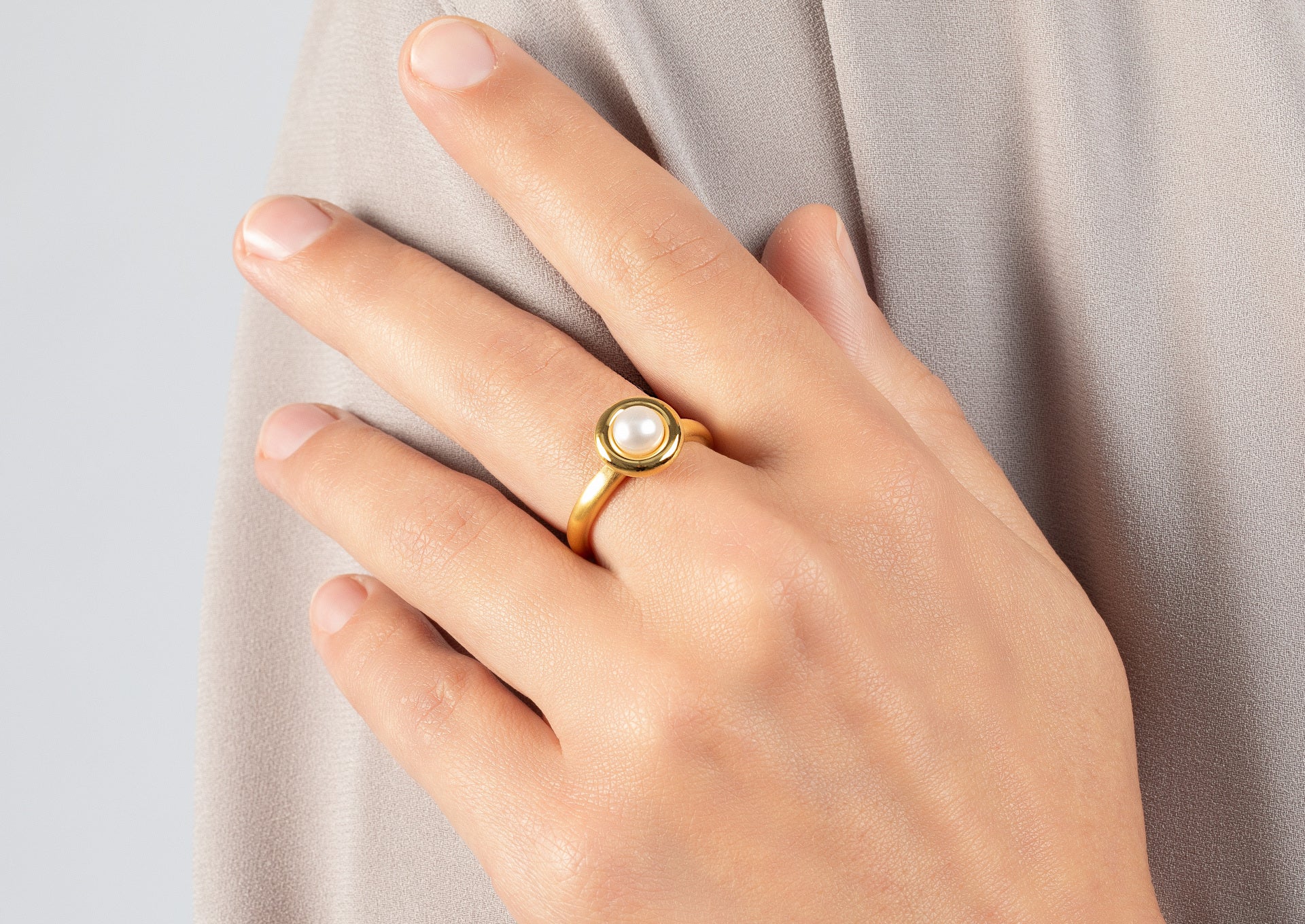 Dieser edle, vergoldete Ring aus mattiertem und poliertem 925/- Sterlingsilber bringt die weiße Süßwasserzuchtperle (1,53ct) als Symbol zeitloser Schönheit perfekt zum Ausdruck. Ein schlichtes und zugleich elegantes Schmuckdesign der Designerin Nadine Resch.
