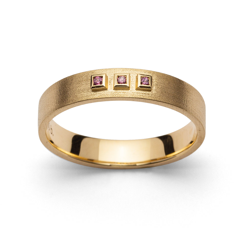 Strahlendes 750/- Gelbgold formt sich zu einem mit drei farbstarken Rhodolithen (0,03ct) versehenen Fingerschmuck in feinster Manufakturqualität. Ein zeitloses und durch die intensive Strahlkraft der im Round Star Cut geschliffenen Edelsteine zugleich modern daherkommendes Design-Schmuckstück aus der Feder des aus Osnabrück stammenden Designers Dietmar Sebastian. Perfekt in Kombination mit passenden Ohrsteckern und passendem Anhänger. Ausschließlich im Fachhandel erhältlich!
